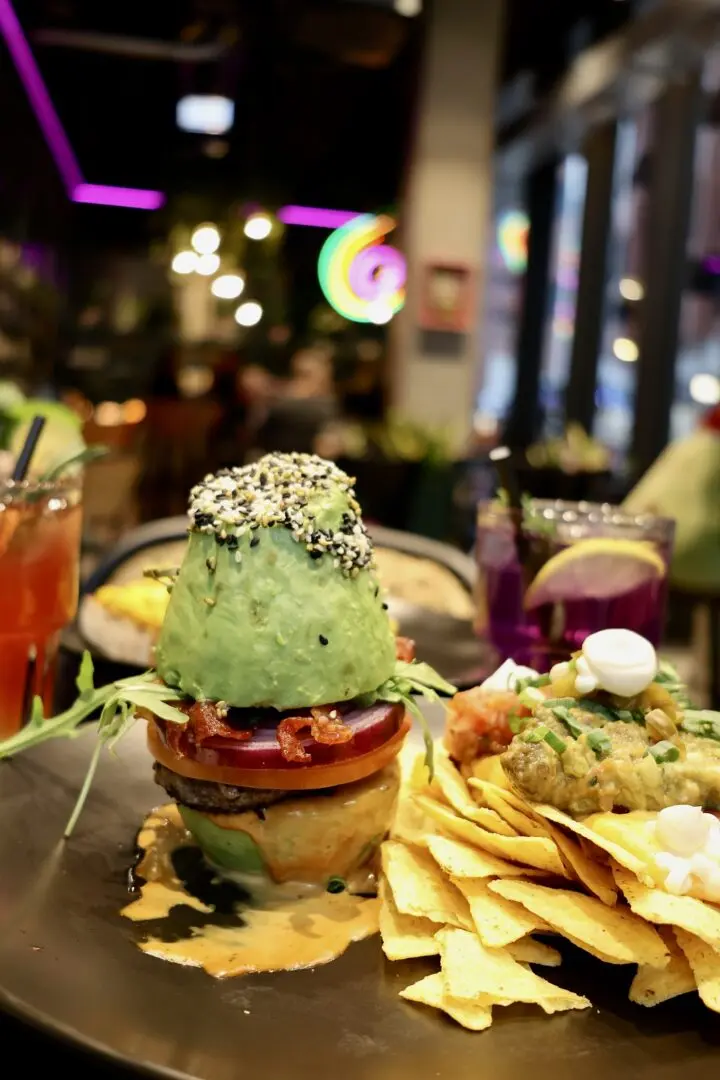 - Bun Burger – Burger with avocado halves instead of a bun, beef, bacon, lettuce, and tomato, served with nachos – €16.90