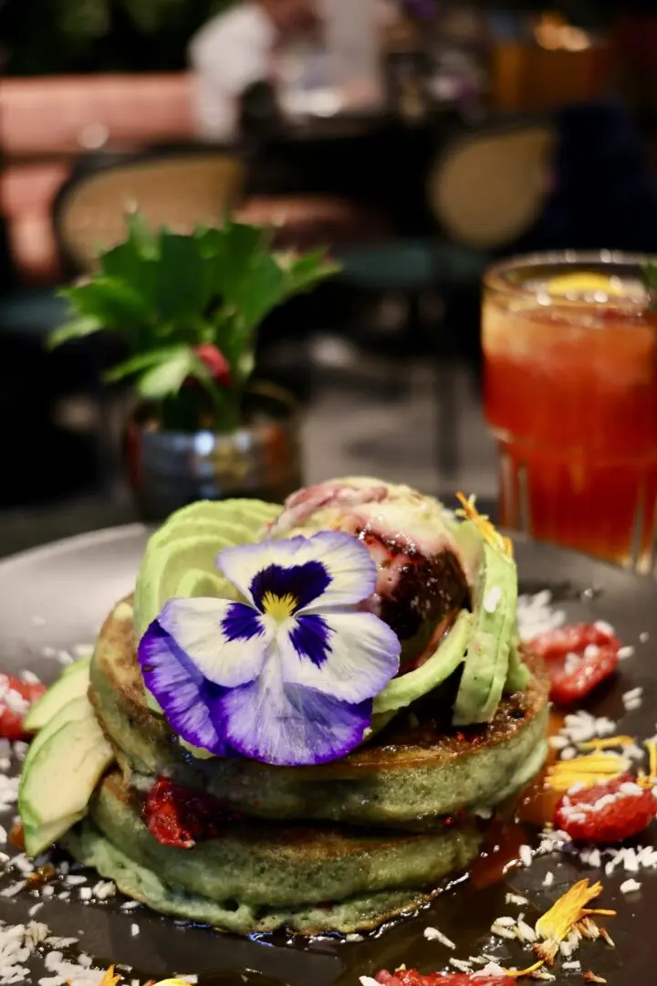 - Sweet Stack – Spirulina pancakes with avocado ice cream, raspberries, and vegan dulce de leche – €14.10