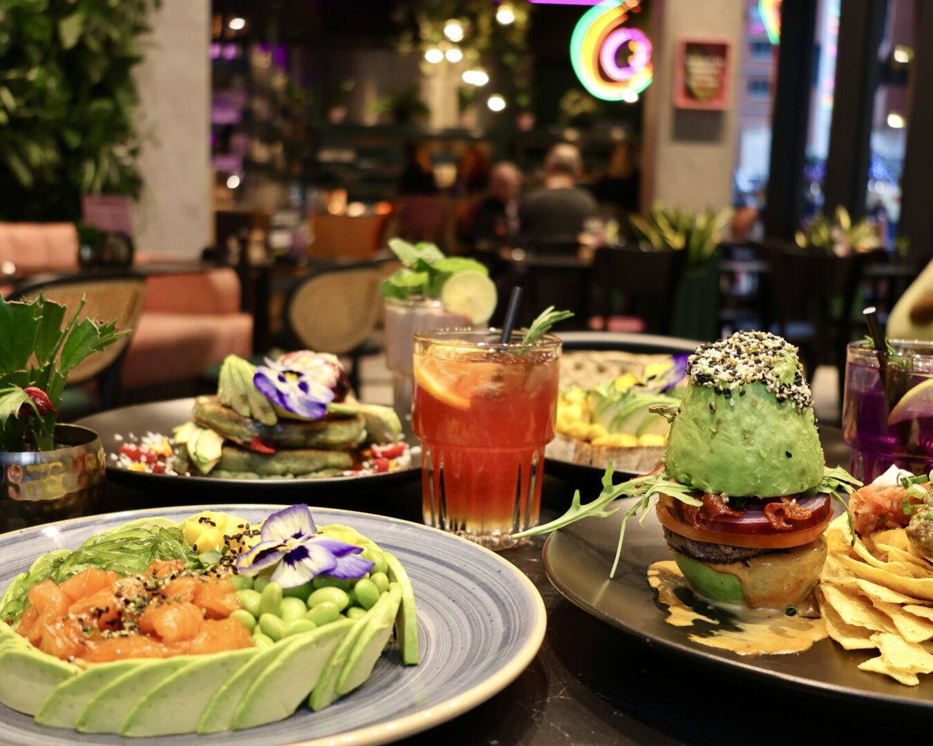 Schon beim Vorbeigehen bleibt man kurz stehen: Durch die riesigen Glasfronten strahlen bunte Lichter, drinnen sieht man stylische Pflanzenwände, schicke Hochtische und gemütliche Bänke. Jeder Winkel ist ein kleines Bühnenbild – gemacht für den perfekten Schnappschuss. Die Einrichtung ist ein Mix aus urbanem Dschungel, Industrial-Design und Pop‑Art – das Ganze schreit nach einem ausgedehnten Brunch mit Freund*innen oder einem späten Lunch mit Aussicht auf die Hafencity.